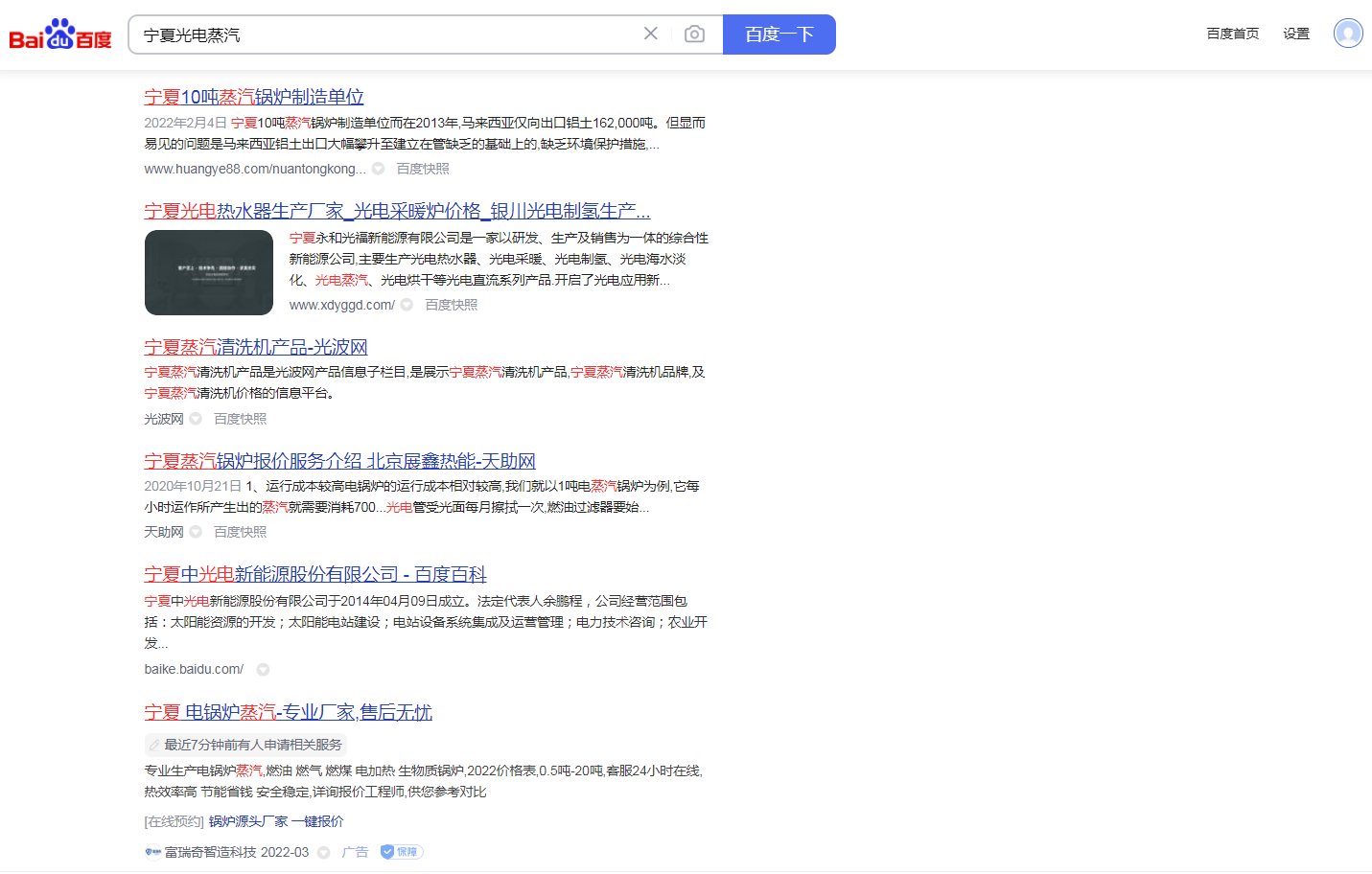 此外,萬家燈火CMS系統助力永和光福新能源官網上線半個月被搜索引擎收錄,且關鍵詞:寧夏光電蒸汽、銀川光電烘干技術、寧夏光電熱水器生產廠家、寧夏光電海水淡化均在百度首頁展現,讓客戶無論是通過PC端還是移動端,都能隨時隨地找到永和光福新能源。