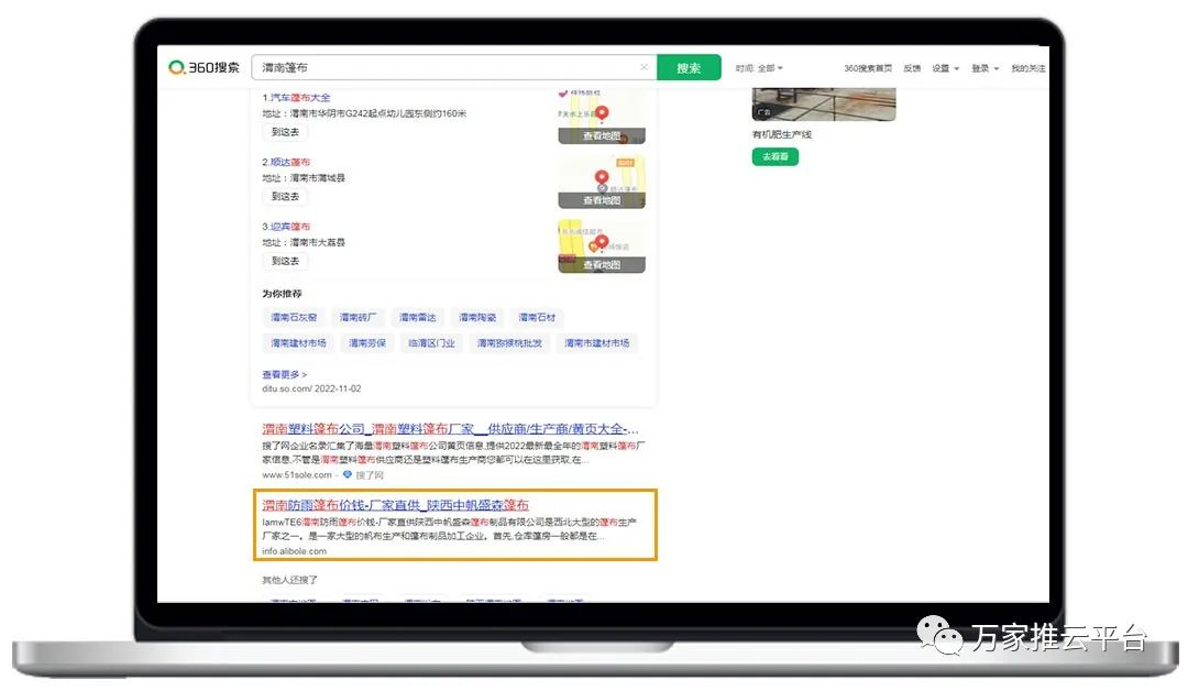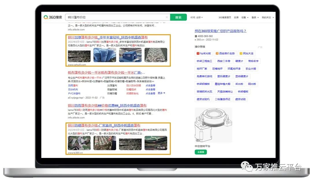 >>>B2B商盟:銅川篷布價位、榆林防曬篷布等關鍵詞均在360搜索引擎平臺首頁展現。